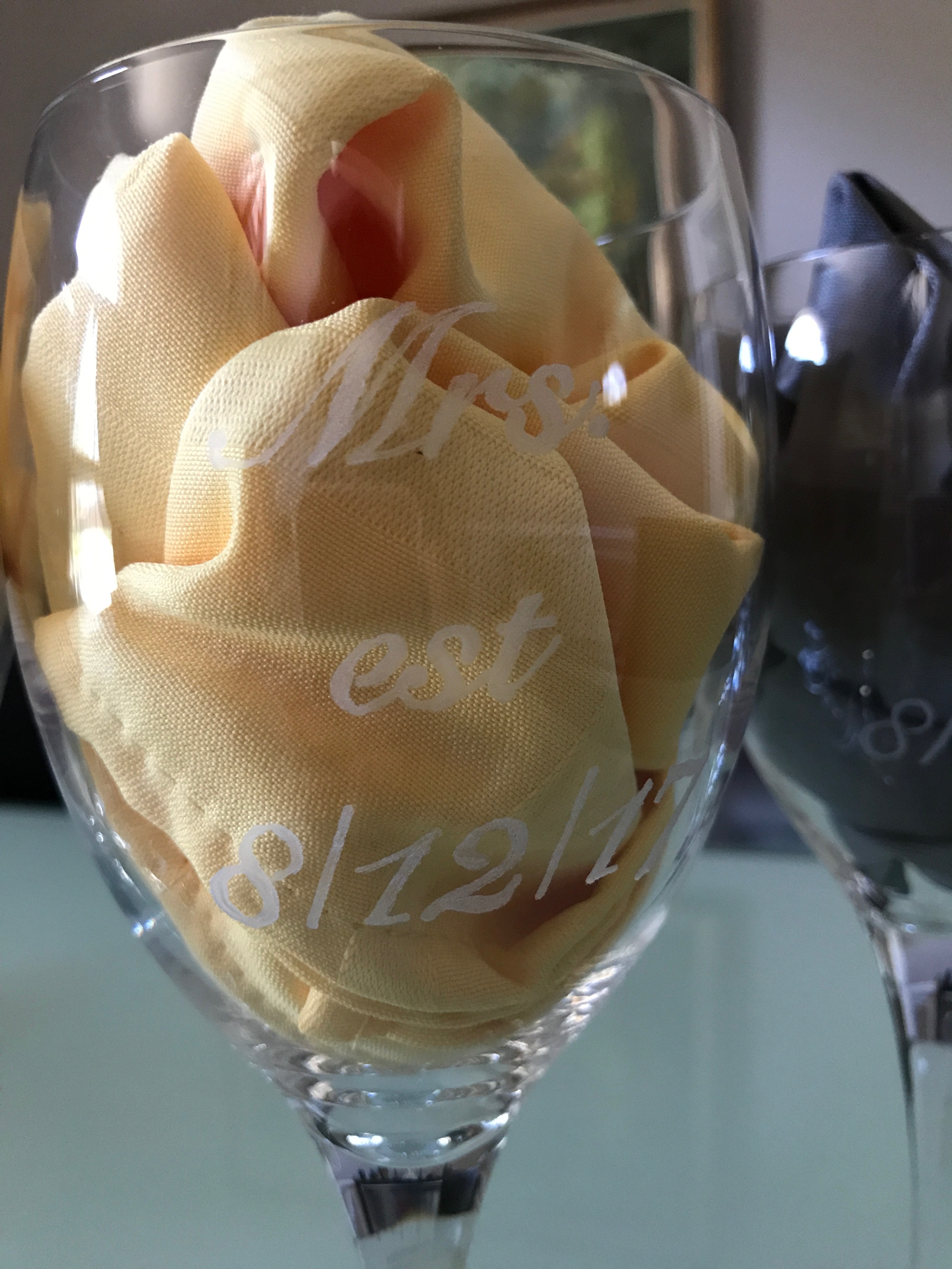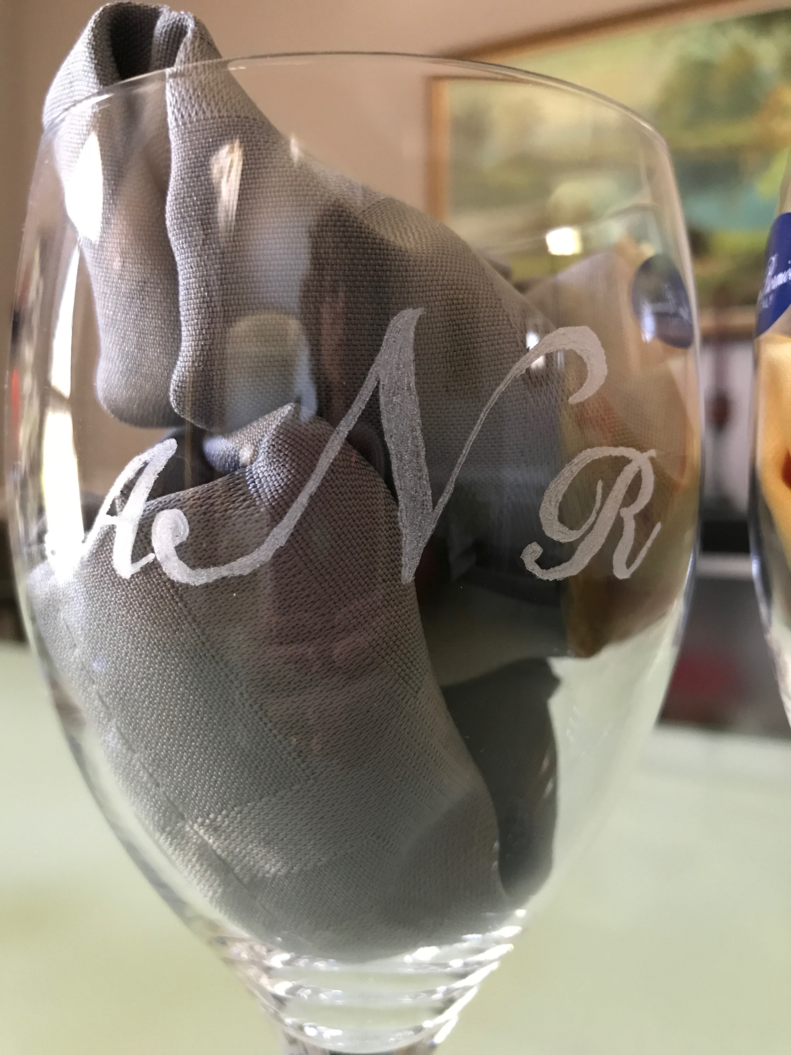 Your choice of wine glasses, engraved to your specifications. Please email me your information.