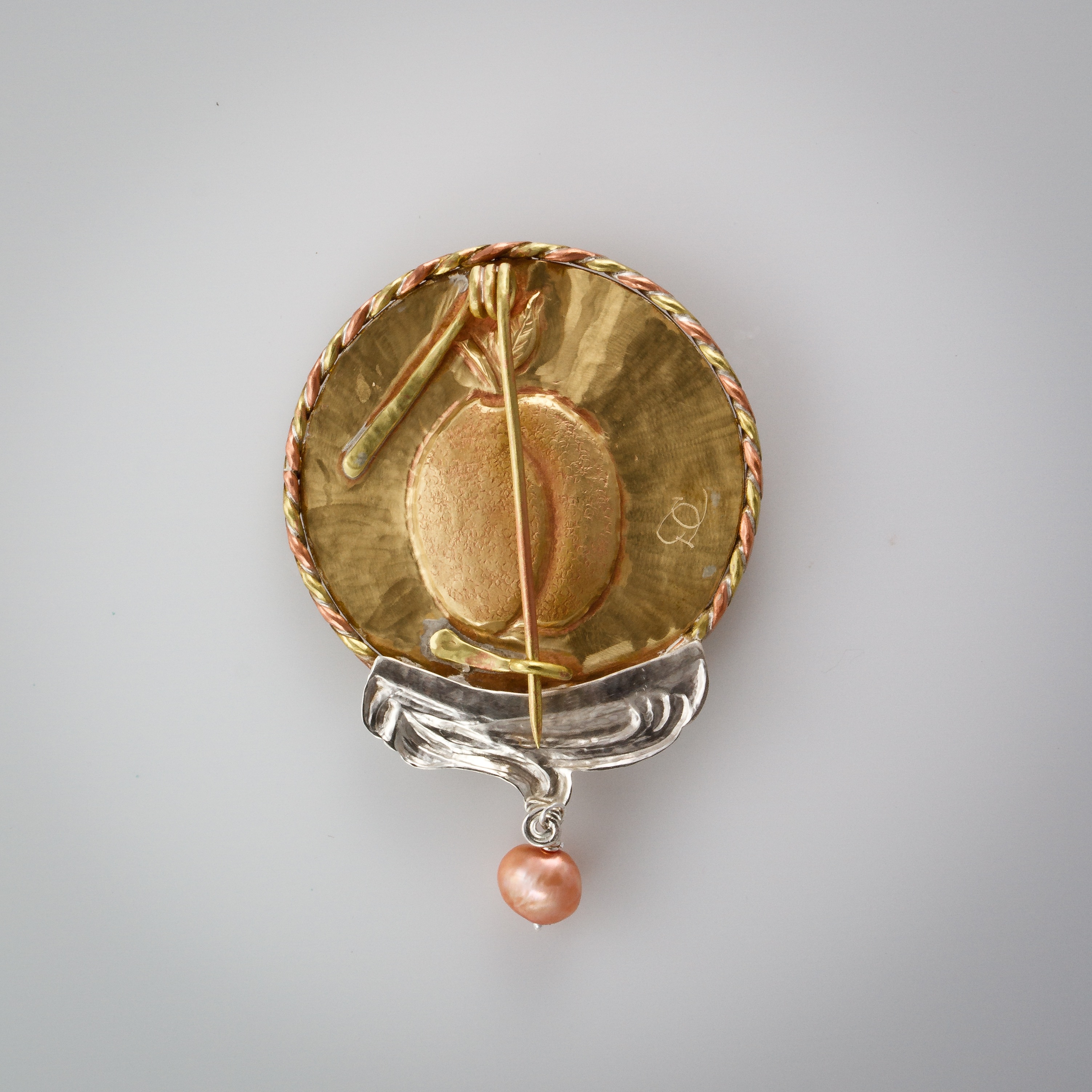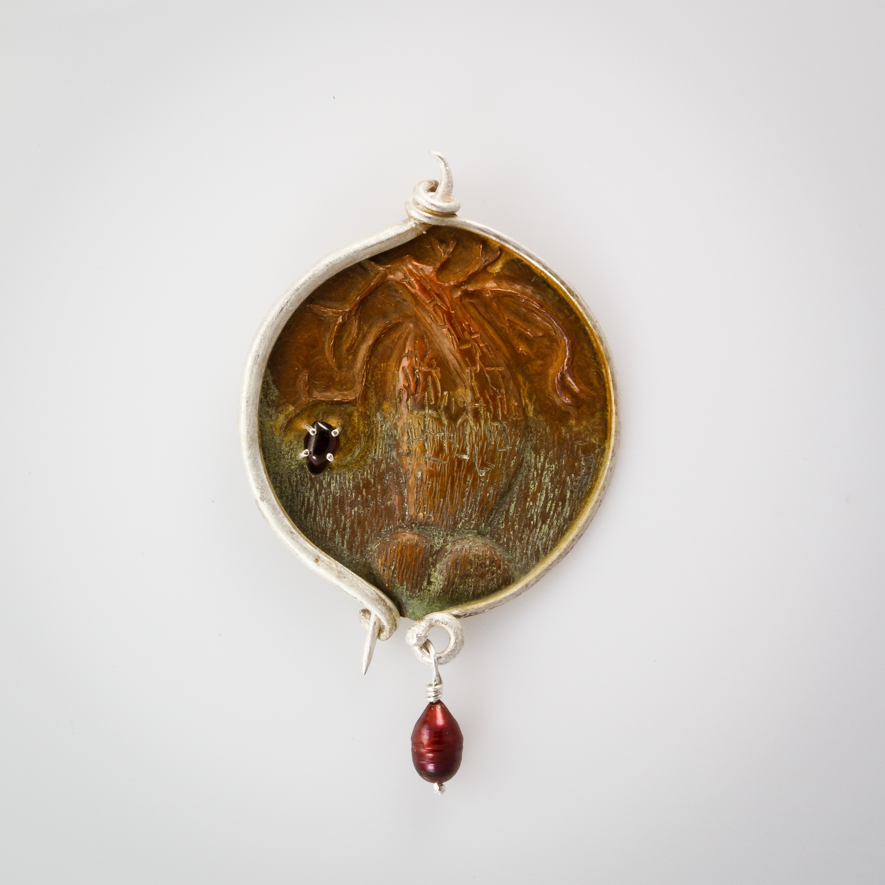 Sterling silver, red brass, copper, Sunstone, peach Baroque pearl