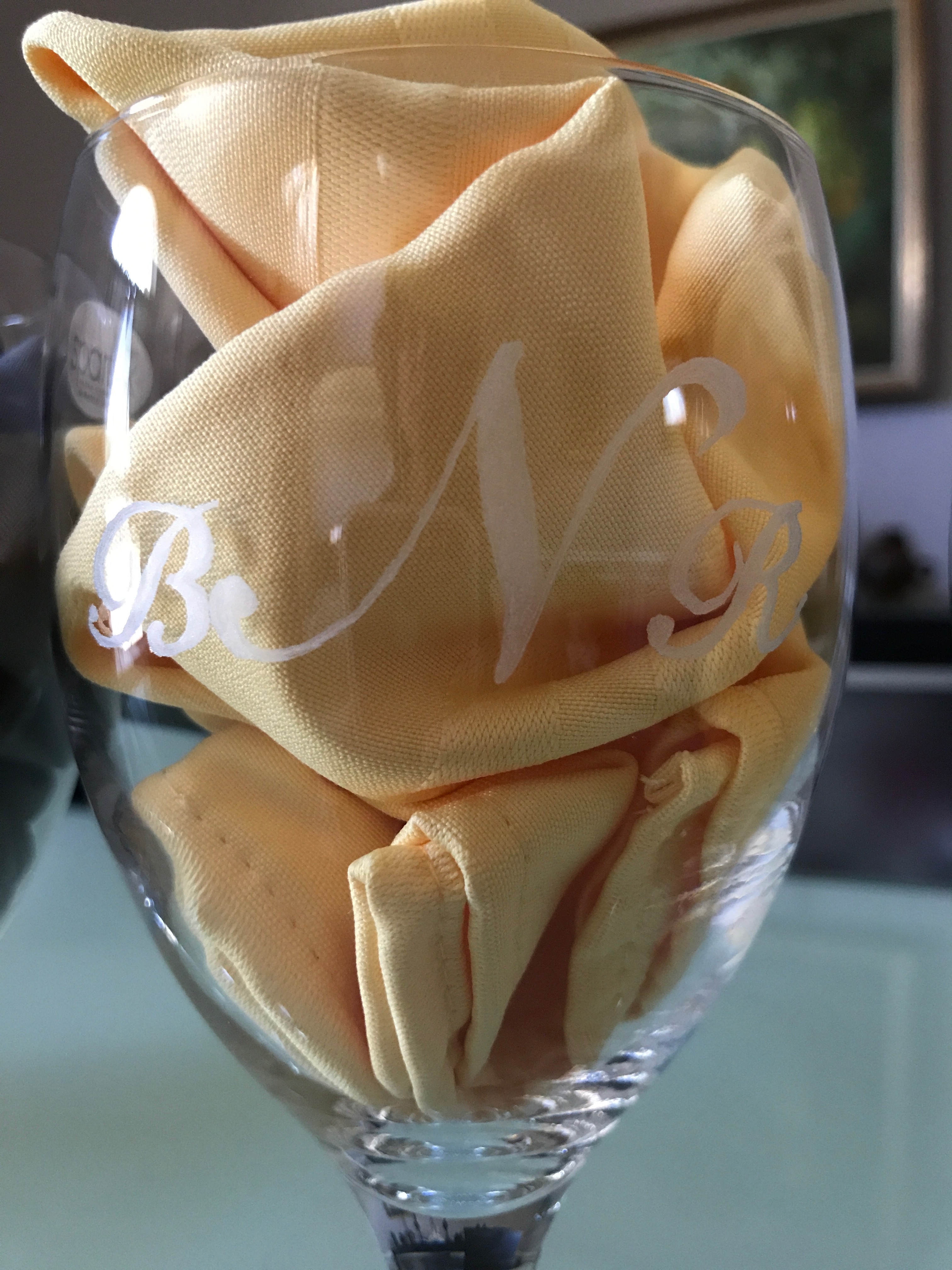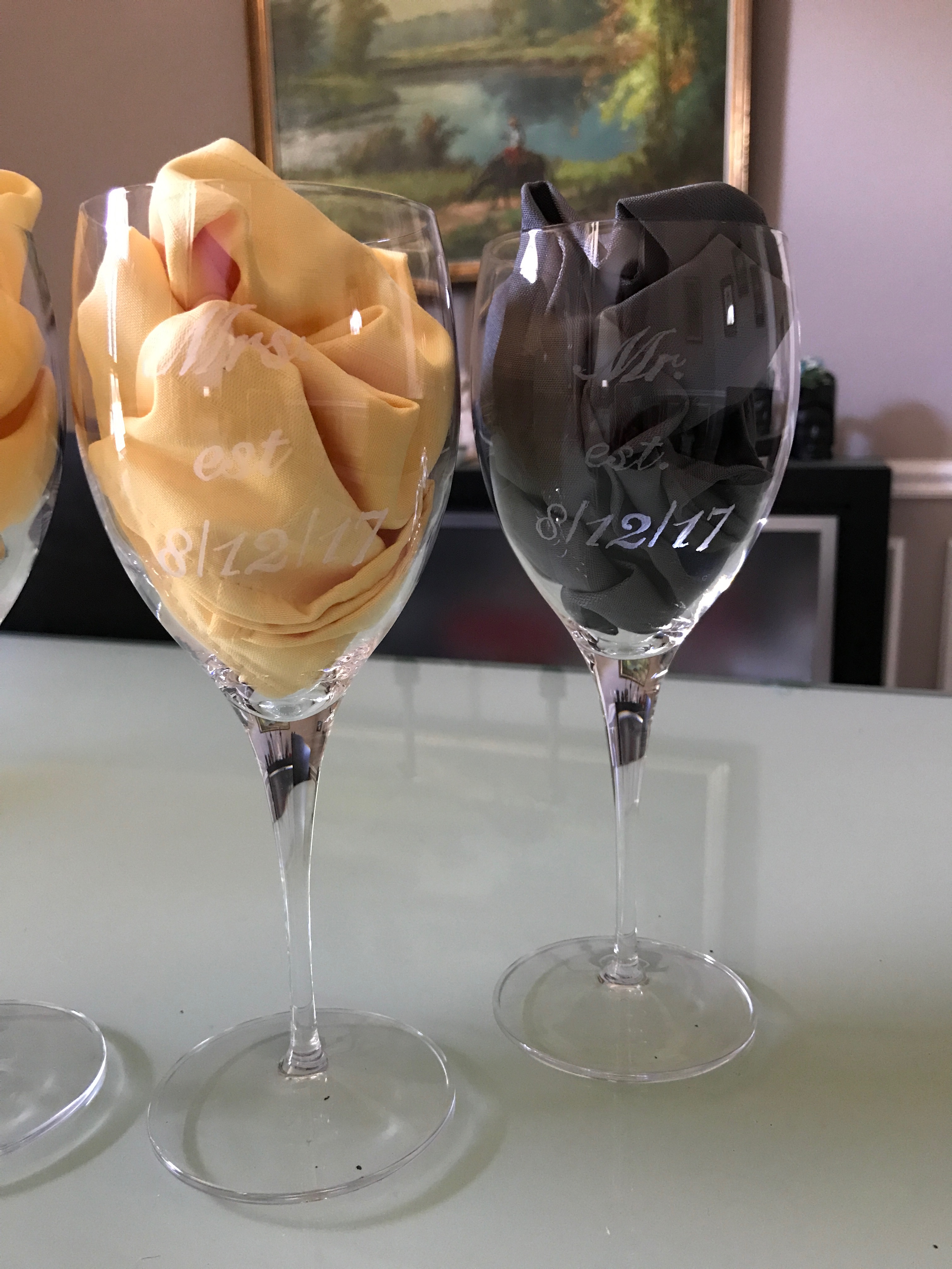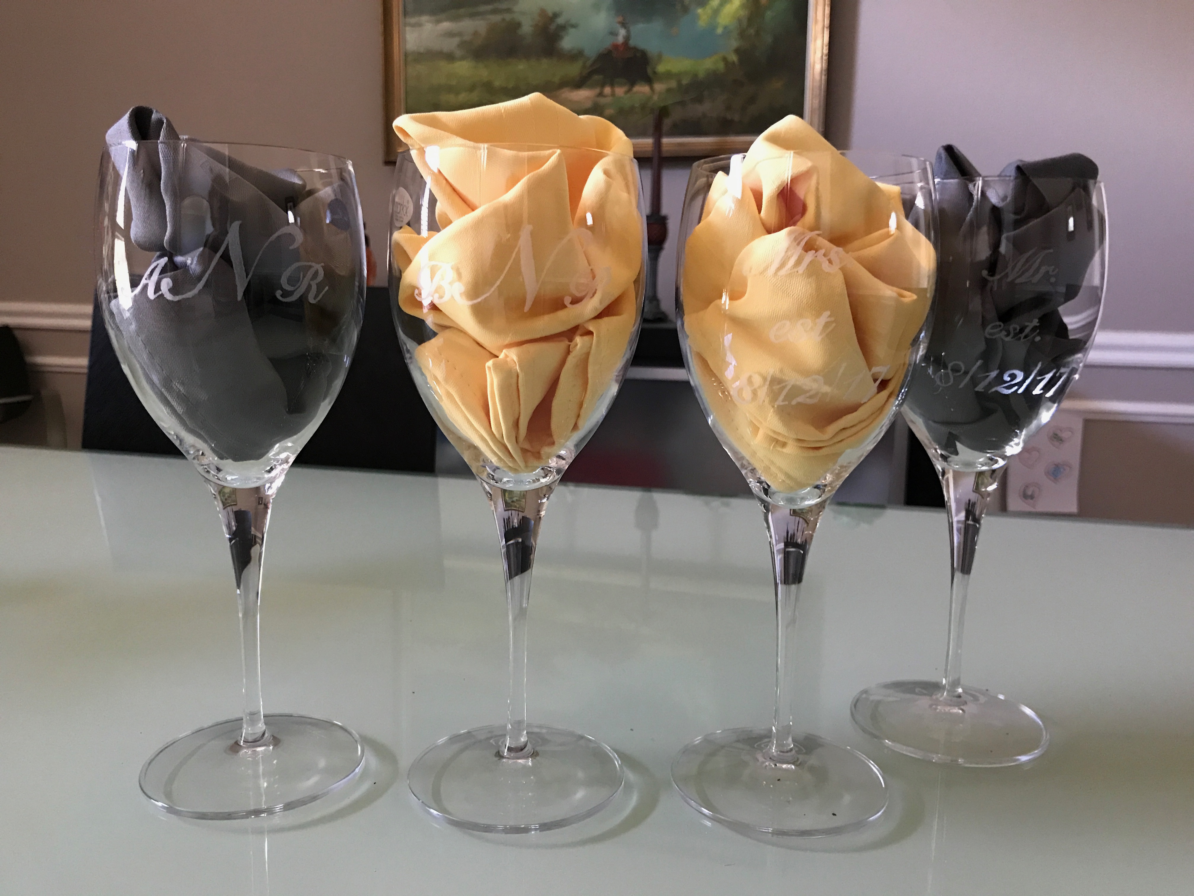 Your choice of wine glasses, engraved to your specifications. Please email me your information.