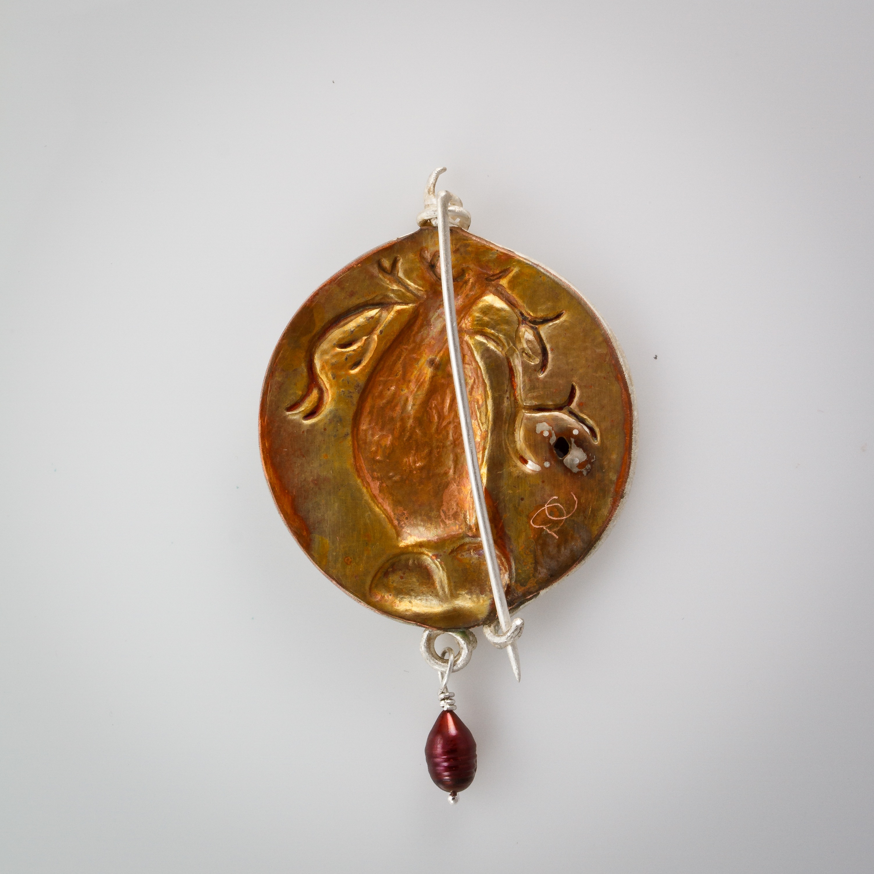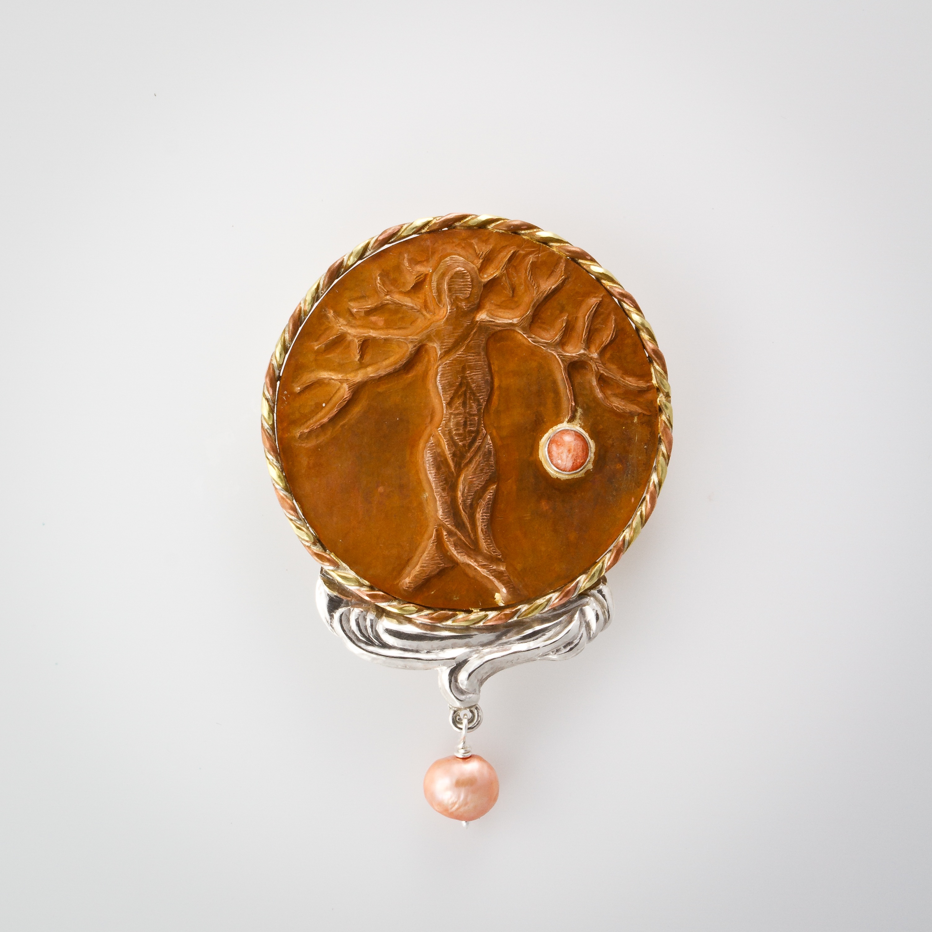 Sterling silver, red brass, copper, Sunstone, peach Baroque pearl